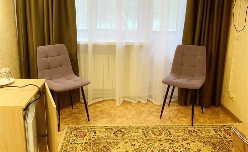 В номере есть всё необходимое для комфортного проживания: кровать односпальная, ванная комната с душем, раковиной и унитазом; балкон с видом на лес, телевизор с цифровым ТВ и Wi-Fi; настольные лампы, кулер, мини-холодильник; шкаф, обеденный стол, тумбы, вешалки.